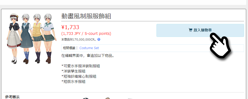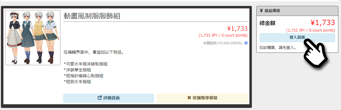 商品一覽頁面或各商品詳細頁面的「放入購物車」按鈕,將欲購買的商品放入購物車內。